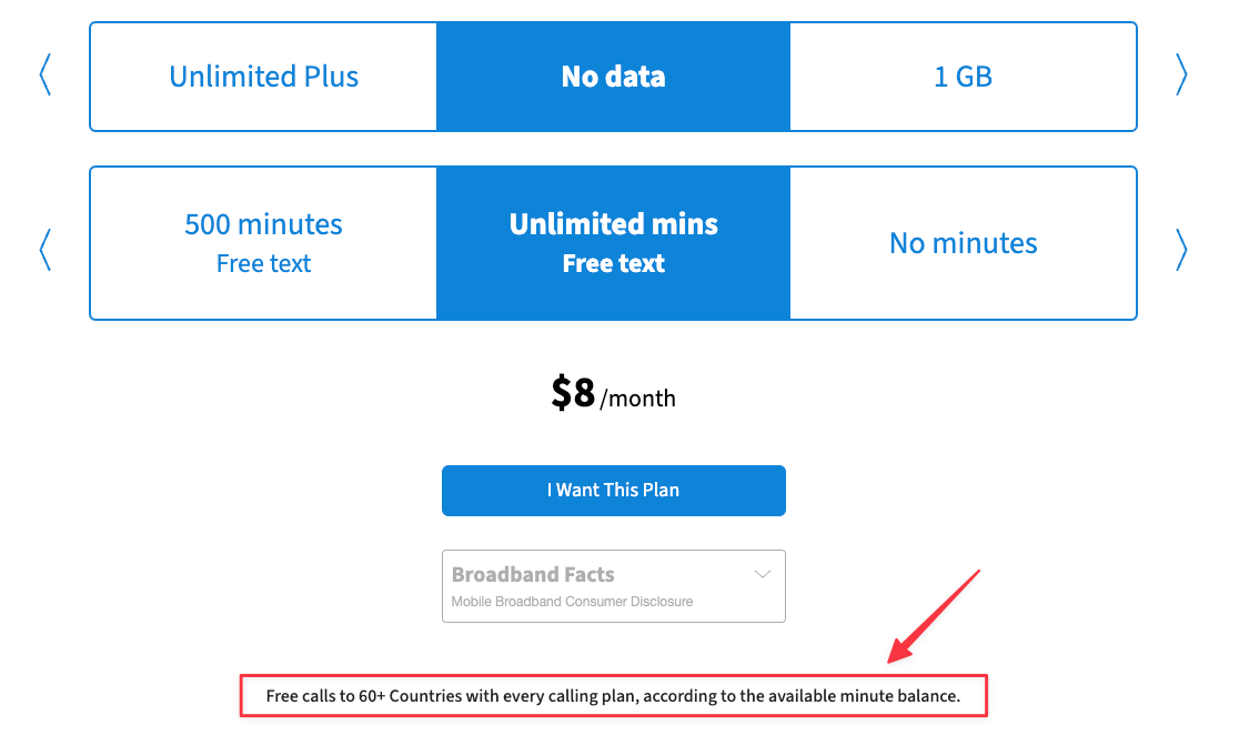 选择「100 Minutes Text」和「No data」5 USD月租套餐