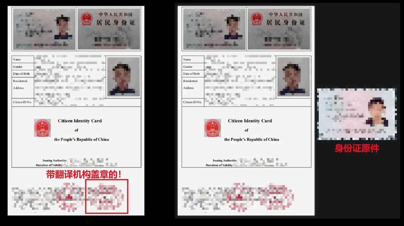 其中身份证的翻译件可以在淘宝找人做。这个翻译件我们可以用 A4 纸打印处理,首先用身份证的原件一起,拍照上传就可以了。